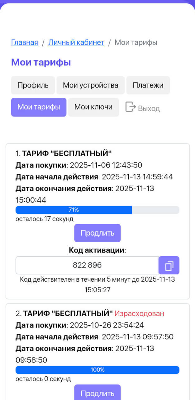 Таким образом, код активации служит удобным инструментом для передачи тарифов и ключей между пользователями, обеспечивая гибкое использование сервисных возможностей. Он упрощает процесс активации подписок и позволяет быстро обмениваться доступами через личный кабинет и приложение.
